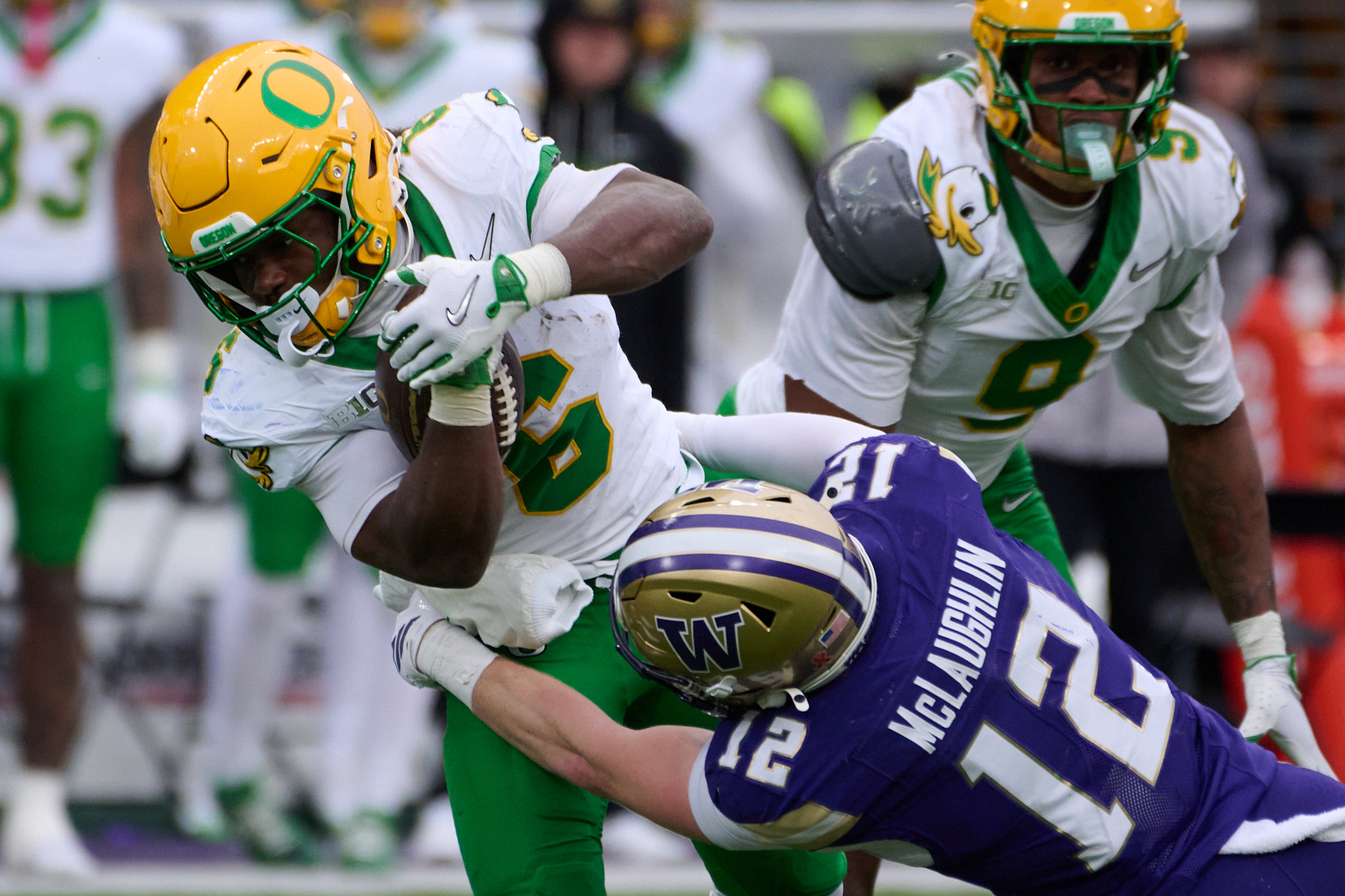 SEATTLE, WA — No. 6 Oregon leaned on a suffocating defense and a pair of explosive second-half plays to defeat Washington 26–14 on Saturday, Nov. 29, and keep its Big Ten title hopes alive.